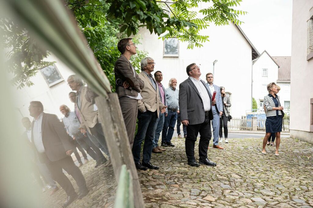 Foto: Europastaatssekretär Mark Weinmeister mit Mitgliedern des Vereins und Vertretern des Denkmalschutzes vor dem Mönchehof in Espenau (Fotografin: Patricia Welp, Bildrechte: Hessische Staatskanzlei)