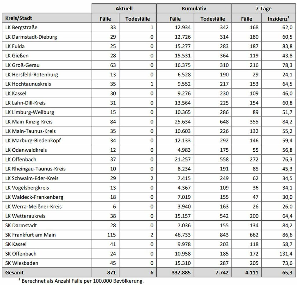 Donnerstag: Sechs Corona-Tote und 871 Neuinfektionen in Hessen