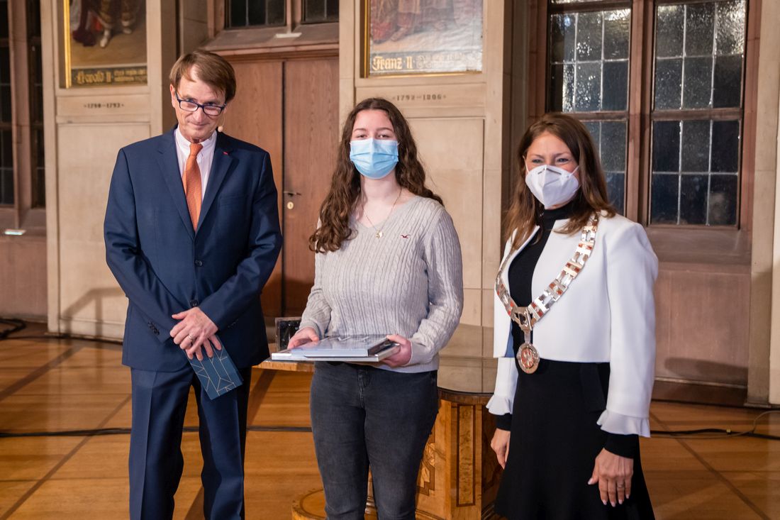 Foto: Christophe Braouet, Präsident der Deutsch-Französischen Gesellschaft, Wettbewerbssiegerin Orgele Aziz und Bürgermeisterin Nargess Eskandari-Grünberg, Copyright: Stadt Frankfurt am Main, Foto: Holger Menzel