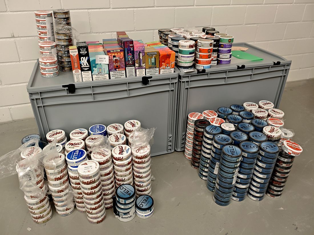 Hier wurden drei Verstöße gegen das Jugendschutzgesetz sowie neun Verstöße gegen das Verpackungsgesetz festgestellt, insbesondere aufgrund fehlender Pfandsiegel. Zudem stellten die Behörden 613 Dosen sogenannter „Nicopods" sowie 59 unversteuerte E-Zigaretten sicher. In einem weiteren Fall wurde ein Verstoß gegen die Waffenverbotszone festgestellt, nachdem ein Kioskkunde ein Messer mit sich führte.