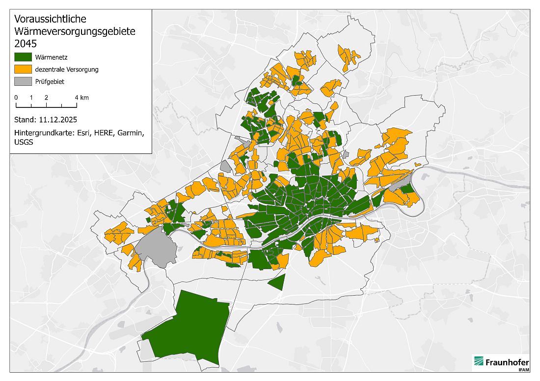 Die Grafik zeigt die Karte der Stadt Frankfurt mit den voraussichtlichen Wärmeversorgungsgebieten, Copyright: Fraunhofer IFAM