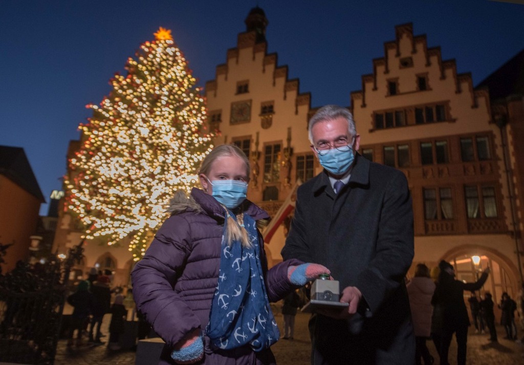 „Heute schlagen wir dem Virus ein Schnippchen“, sagte Oberbürgermeister Peter Feldmann. „Jeder soll sehen: Wir passen auf, halten uns an die Regeln – aber wir lassen uns die Weihnachtsstimmung nicht vermiesen.“ Der Baum tauche den Römerberg in ein fast schon magisches, feierliches Licht, sei ein Zeichen gesellschaftlicher Solidarität: „Wir üben Verzicht, um die zu schützen, die wir lieben. Damit zeigen wir, dass wir die Weihnachtsbotschaft verstanden haben.“