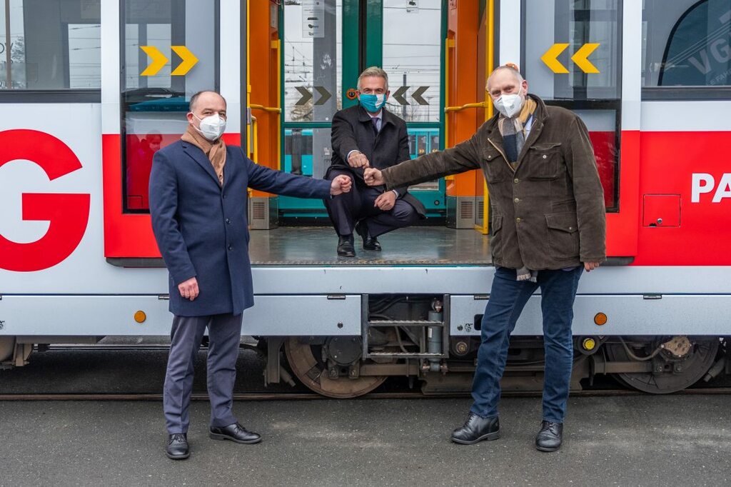 Die Bahn rollte im Anschluss bei einer Fahrt gemeinsam mit den Gästen auf die Gleise und wird ab sofort die Flotte der VGF-Städtepartnerschaftsbahnen verstärken.
