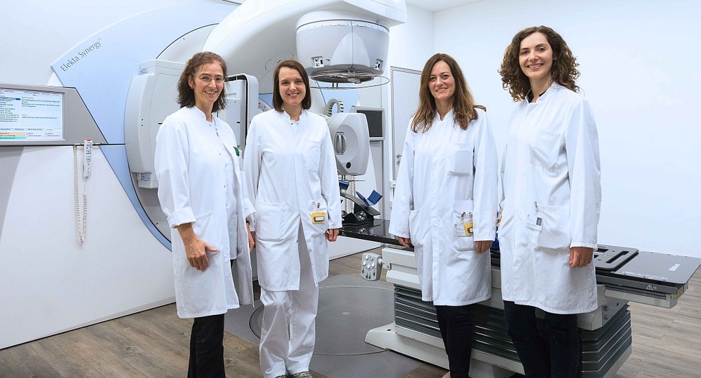 Foto: Frau Prof. Daniela Schulz-Ertner (2. von rechts) und ihre ärztlichen Kolleginnen setzen die neueste Version der atemgesteuerten Strahlentherapie ein. Foto: AGAPLESION FRANKFURTER DIAKONIE KLINIKEN