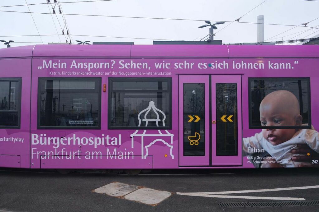 Um in Frankfurt auf die Belange frühgeburtlicher Versorgung aufmerksam zu machen, hat die Neonatologie mit zahlreichen Spendern und Unterstützern eine Straßenbahn der VGF gestaltet, die seit Monatsanfang auf ihren Fahrten durch die Stadt zu sehen ist – unter anderem mit Fotos von Kindern, die ursprünglich als Frühgeborene im Bürgerhospital auf die Welt gekommen sind. „Frühgeburten sind auch eine Belastungsprobe für junge Eltern. Uns ist es wichtig, eine Neonatologie in unserer Stadt zu wissen, die nicht nur die Frühgeborenen professionell versorgt, sondern auch die Eltern mit der nötigen Sensibilität einbezieht“, erklärt Maya Baußmann-Herr, Gründerin der Elterninitiative NeoEltern, die die Aktion unterstützt hat.