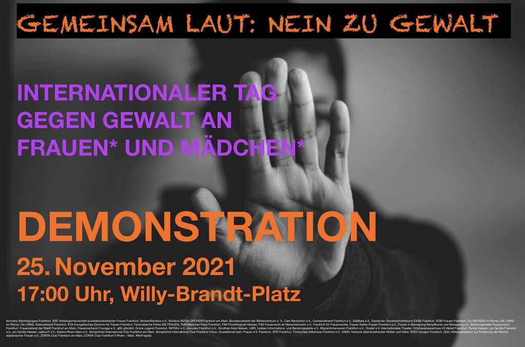 Aktuelle Informationen und weitere Aktionen sind zu finden auf der Webseite des Frauenreferates unter Internationaler Tag gegen Gewalt an Frauen* und Mädchen* | Stadt Frankfurt am Main.