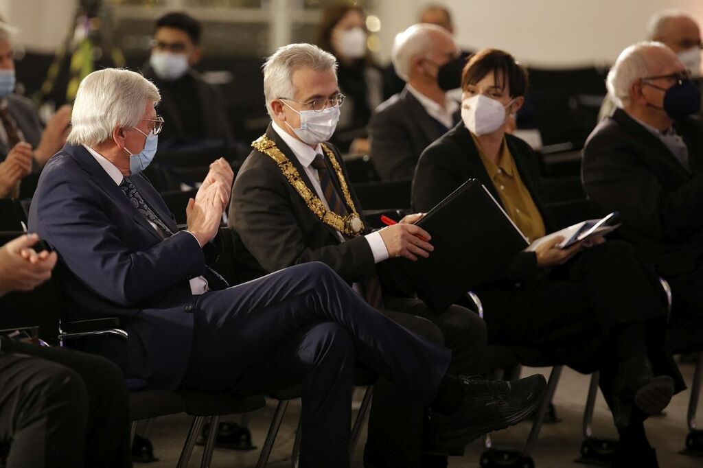 Foto: Hessens Ministerpräsident Volker Bouffier, Oberbürgermeister Peter Feldmann und HSFK-Leiterin Prof. Nicole Deitelhoff, Copyright: Stadt Frankfurt am Main, Foto: Bernd Georg