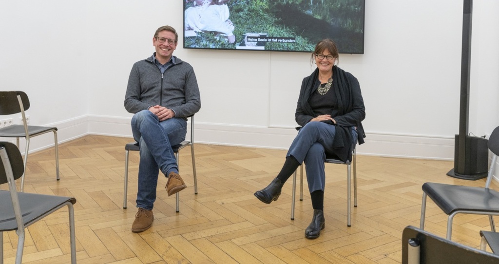 Foto: Markus Lindner und Mona Suhrbier in der Ausstellung "Let Them Speak" im Weltkulturen Museum. Foto Wolfgang Günzel