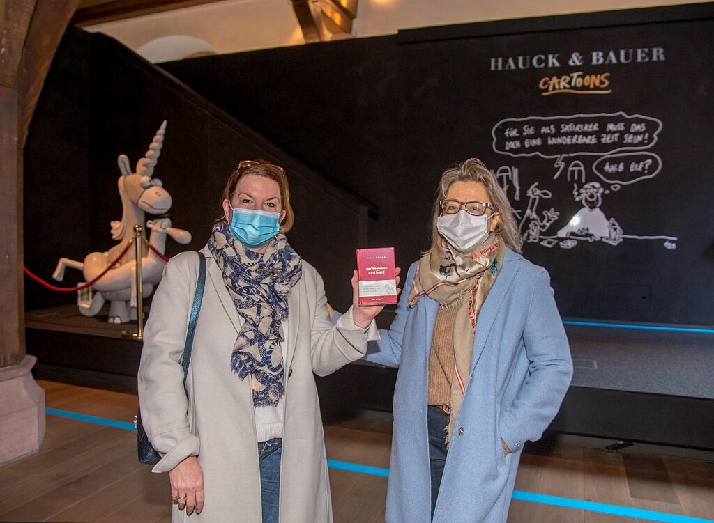 Bettina Engelhardt und Eva Hüskers, beide aus Frankfurt, hatten sich „heute Morgen fürs Caricatura Museum entschieden, um mal wieder was zu lachen zu haben!“ Dafür ist das Haus da! Schnell wurde noch feierlich ein Buch zur Hauck & Bauer-Ausstellung überreicht, dann stand dem Ausstellungsbesuch nichts mehr im Wege.