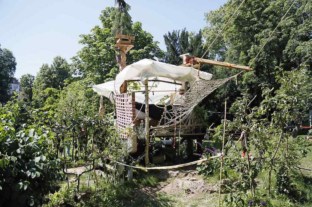 Im Hintergrund ragt der Commerzbank-Turm zwischen den Baumwipfeln hervor. Er schafft einen unwirklichen Kontrast zum länglichen Zeltpavillon, der umgeben von einem goldenen Gerüst am nördlichen Ende des Metzlerparks steht. Die Installation des US-amerikanischen Künstlerduos Mia Eve Rollow und Caleb Duarte widmet sich Aspekten von Vertreibung, Flucht und Migration. Vier Migranten aus Frankfurt haben selbst beim Aufbau mitgewirkt. So haben viele Projekte in ihrer Entstehung schon einen interaktiven Charakter. Der „Käfig“ symbolisiert einen ambivalenten Zufluchtsort, spielt an auf Ausgrenzung und Integration, die stetig zu verhandelnden Grenzen zwischen Innen und Außen, denen jede Migrationsgeschichte auf ihrem Weg begegnet. Seefrachtkisten gestalten das Innere. Sie verweisen darauf, wie Grundrechte im Kontext der Flucht verschwinden und der Mensch zur Ware wird. Überhaupt ist jedes Detail sorgsam durchdacht. Auch die goldene Farbe wurde nicht ohne Grund gewählt. Sie steht für die Rettungsfolie, die unterkühlten Körpern, zum Beispiel nach einem langen Aufenthalt im Wasser, das Leben sichern kann.