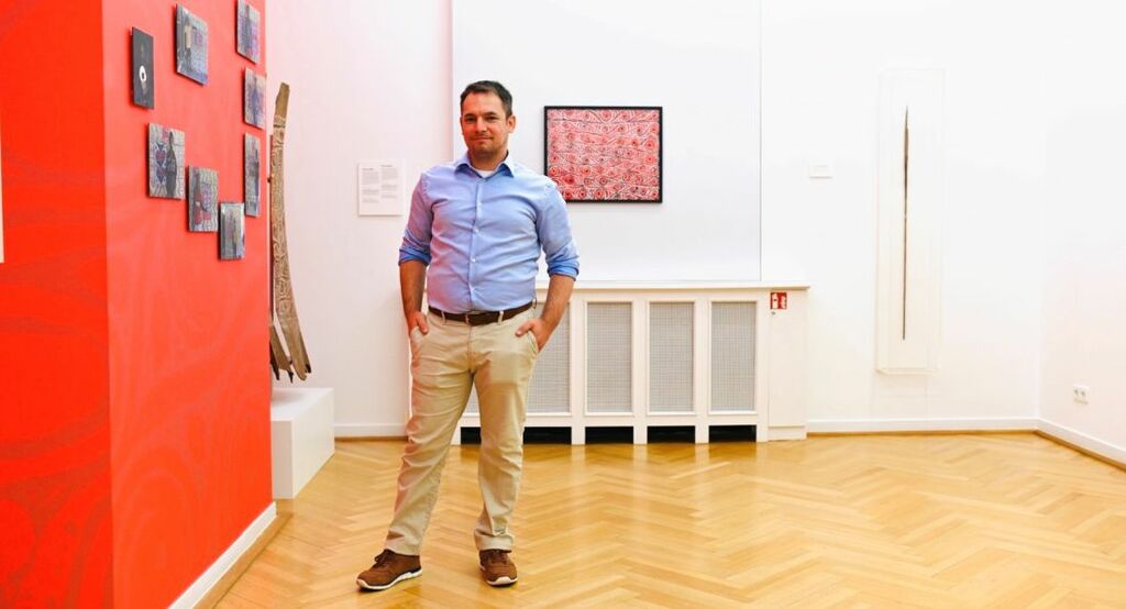 Foto: Tomi Bartole in der Ausstellung „Grüner Himmel, Blaues Gras“, Weltkulturen Museum 2021. Copyright: Peter Wolff