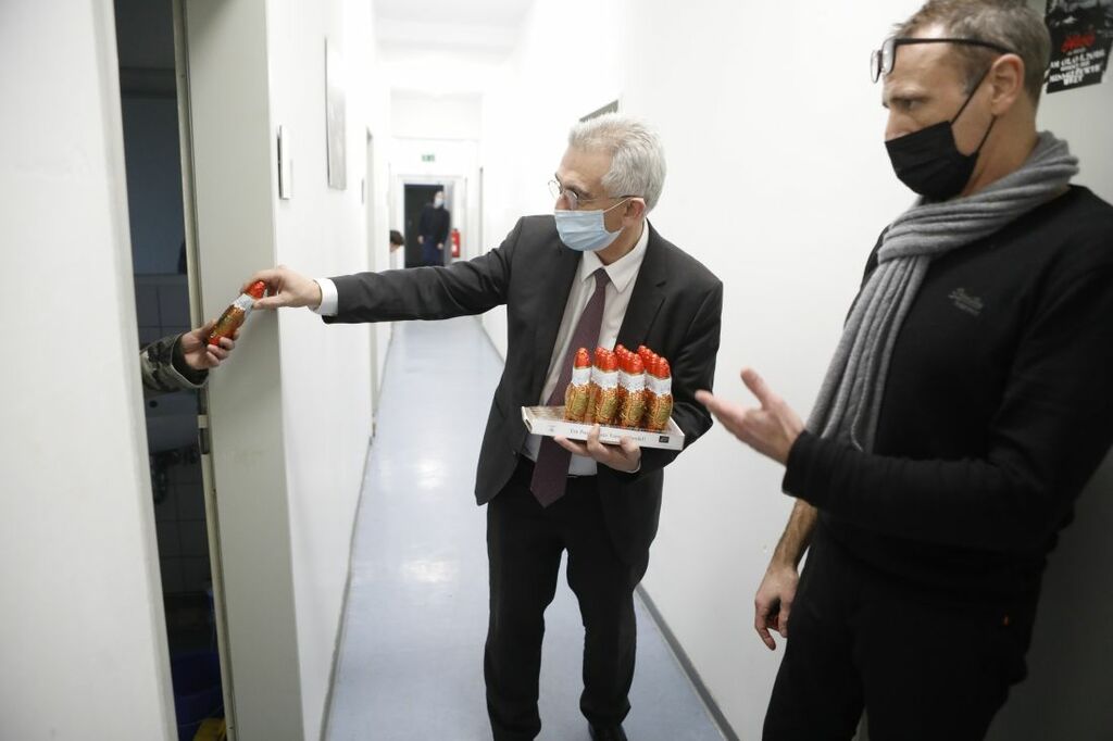 In der Einrichtung erschien das Stadtoberhaupt nicht nur mit Neugierde für die Arbeit der Mitarbeitenden und Empathie für die Lage der Bewohner. Um die Arbeit der Einrichtung zu unterstützen, überreichte Feldmann auch eine Weihnachtsspende aus dem Budget des Oberbürgermeisters in Höhe von 2000 Euro sowie fair gehandelte Schoko-Weihnachtsmänner für alle Bewohner und Mitarbeitenden.