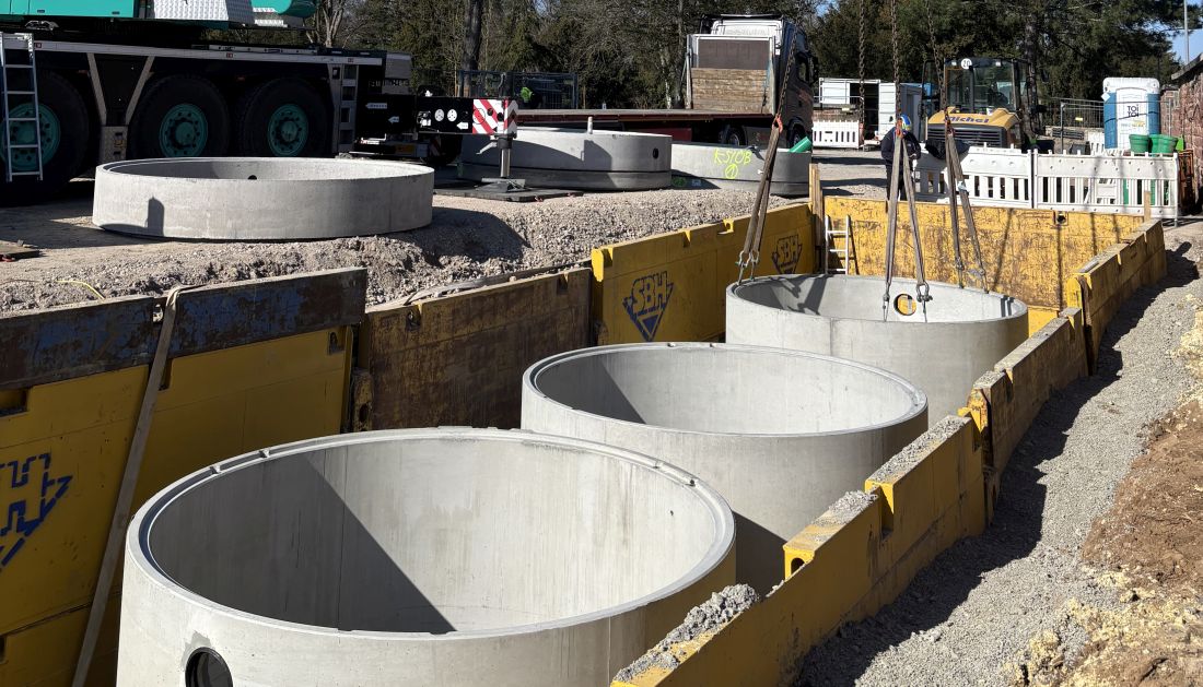 Jetzt wurden drei Zisternen mit je 17 Kubikmeter Fassungsvermögen eingebaut. Damit sind Bauarbeiten auf dem Friedhof im Zeitplan. Bis Anfang 2027 sollen die Arbeiten auf dem Lagerplatz soweit abgeschlossen sein, dass die nächsten Bauabschnitte rund um die Trauerhalle beginnen können. Auf dem Lagerplatz im Südosten des Südfriedhofs entstehen ein Carport für Geräte und Maschinen, ein Waschplatz sowie Materialboxen. Das Carport erhält ein extensives Gründach mit Photovoltaikanlage zur Eigenstromnutzung. Aufgrund des hohen Versiegelungsgrades wird zudem auf dem Lagerplatz ein nachhaltiges Entwässerungs- und Nutzungskonzept umgesetzt: Regenwasser von Dach- und befestigten Flächen wird in drei Zisternen mit je 17 Kubikmeter Fassungsvermögen gesammelt, gefiltert und künftig für die Bewässerung sowie für den Betrieb des Waschplatzes genutzt.