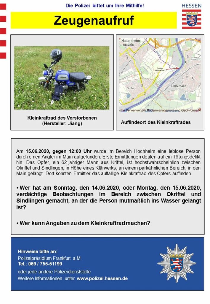 Am Montag, den 15.06.2020, gegen 12:00 Uhr, wurde im Bereich Hochheim eine leblose Person durch einen Angler im Main aufgefunden, welche diverse äußere Verletzungen aufwies. Erste Ermittlungen deuten auf ein Tötungsdelikt hin. Die Staatsanwaltschaft Frankfurt hat ein Ermittlungsverfahren eingeleitet. Das Opfer, ein 62-jähriger Mann aus Kriftel, ist höchstwahrscheinlich zwischen Okriftel und Sindlingen, in Höhe eines Klärwerks, an einem parkähnlichen Bereich, in den Main gelangt.