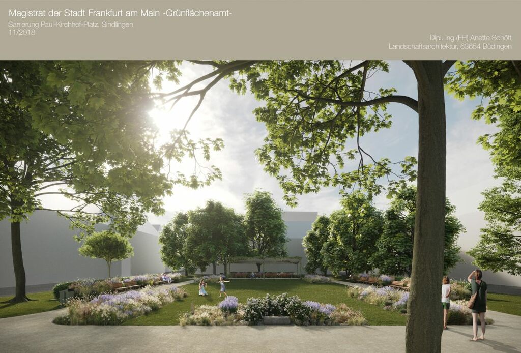 Der gesamte Platz wird nach historischem Vorbild neugestaltet. Es entsteht ein symmetrisches Wegenetz mit attraktiven Sitz- und Aufenthaltsmöglichkeiten entlang der Wege. Große, ausladende Bäume bilden das Grundgerüst für die Gesamtgestaltung ergänzt durch eine attraktive Bepflanzung mit Rosen und Staudenbeeten. Der Gedenkstein für den Sindlinger Widerstandskämpfer, SPD-Kommunalpolitiker und Gewerkschafter Paul Kirchhof, der dem Platz seinen Namen gab, erhält an zentraler Stelle einen würdigen Platz.
