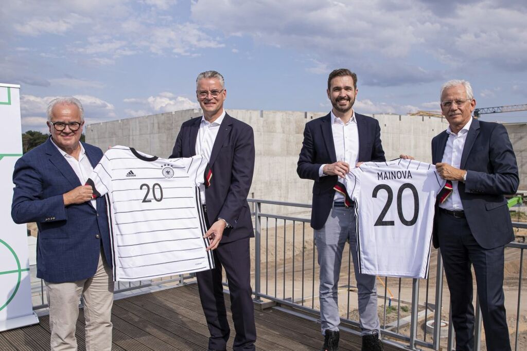 Gemeinsam haben sich DFB-Präsident Fritz Keller und Generalsekretär Friedrich Curtius sowie der Mainova-Vorstandsvorsitzende Constantin H. Alsheimer und Vorstandsmitglied Norbert Breidenbach am Montag, 20. Juli, vor Ort über den Baufortschritt informiert. Der Frankfurter Energiedienstleister gewährleistet künftig die Energie- und Wasserversorgung des gesamten Komplexes.