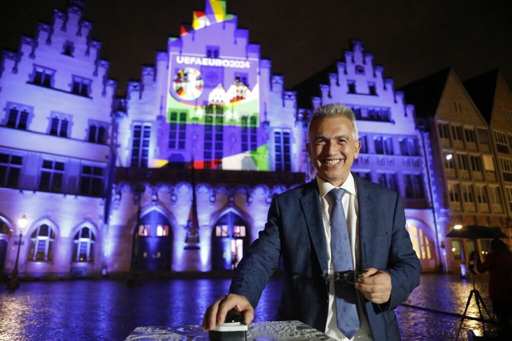 Mit einer spektakulären Illumination des Frankfurter Römers hat Oberbürgermeister Peter Feldmann (SPD) am Dienstag, 5. Oktober, gegen 20.30 Uhr auf das große Fußballfest UEFA EURO 2024 eingestimmt. Begleitet von rhythmischen Klängen wurde erstmals das Turnierlogo des Spielorts Frankfurt zur Fußball-Europameisterschaft vorgestellt, die im Jahr 2024 in Frankfurt am Main und neun weiteren deutschen Städten stattfindet.
