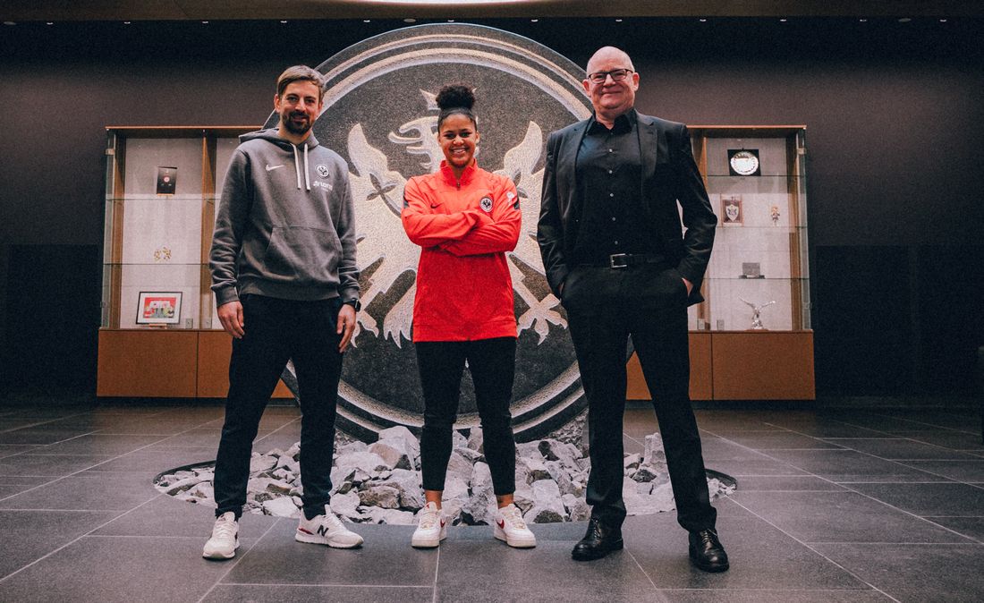 Foto: Trainer Niko Arnautis (links), Shekiera Martinez (Mitte) und Sportdirektor Siegfried Dietrich (rechts). Quelle: Eintracht Frankfurt