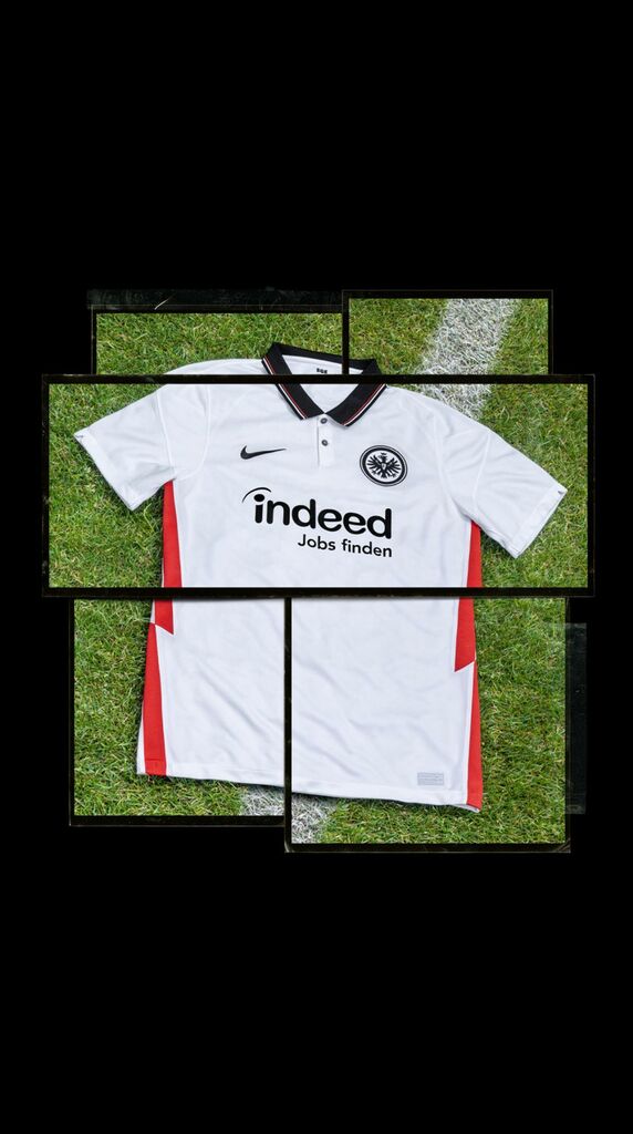 Im Vergleich zur vergangenen Spielzeit weist die Auswärtsvariante einige neue Elemente auf und zeigt sich mit schwarzem Kragen, in den zusätzlich die beiden Vereinsfarben Rot und Weiß sowie zwei Knöpfe im klassisch weißen Retrolook eingearbeitet wurden. Die gerippten Ärmel sind zur kommenden Saison wieder weiß und verzichten auf eine zusätzliche Farbauswahl. An beiden Seiten verlaufen zwei „blitzartige“ rote Streifen von den Ärmeln bis zum Bund. Das Eintracht-Logo ist in Schwarz-Weiß gehalten, ebenso wie der Schriftzug von Hauptsponsor Indeed. Der „Swoosh“ von Ausrüster Nike ist ebenfalls in Schwarz auf der Brust zu sehen.