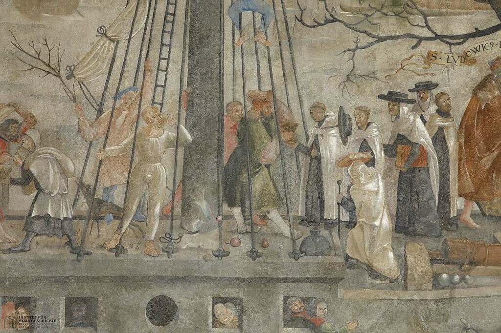 Manche Fragen können weder der Multimediaguide noch die Dauerausstellung im Institut für Stadtgeschichte umfassend beantworten: Wer ist die Dame mit dem ausgefallenen schwarzen Hut? Was hat es mit den Männern bei der Einschiffung auf sich? Warum haben die Wandbilder Fehlstellen? Deshalb können sich Interessierte jeden dritten Sonntag im Monat um 15 Uhr einer fachkundigen Führung anschließen, die sich speziell mit den historischen und kunsthistorischen Aspekten der Wandgemälde von Jörg Ratgeb beschäftigt.