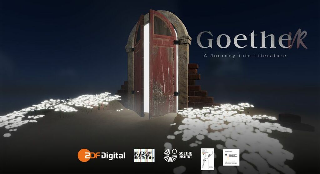 Foto: Szenenbild aus der Goethe Virtual Experience mit einer sich öffnenden Tür und einer Blumenwiese, Schriftzug und Logos. Foto: Deutsche Nationalbibliothek