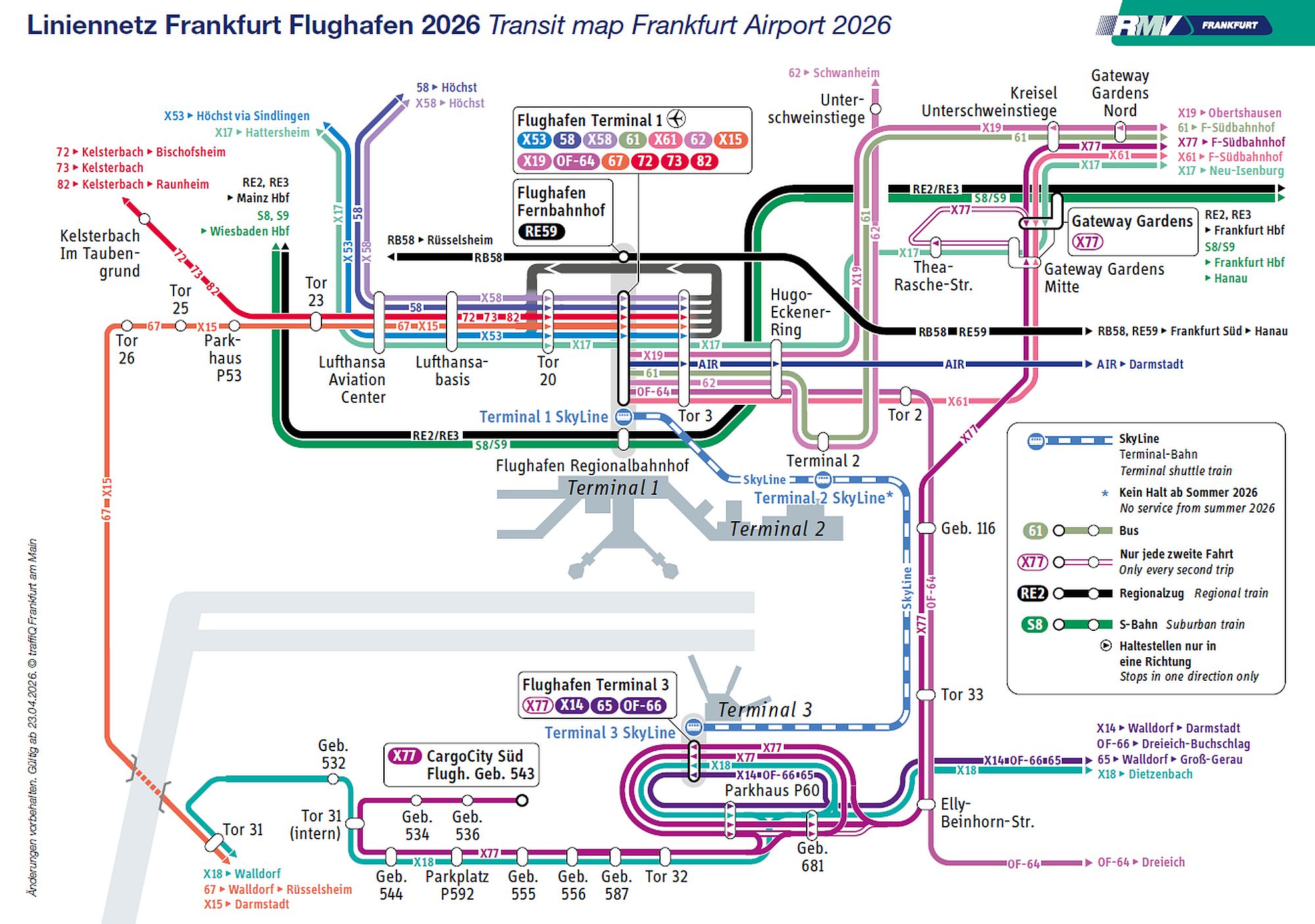 Die Expressbus-Linie X77 fährt im 15-Minuten-Takt zwischen der S-Bahn-Station Gateway Gardens und Terminal 3 und damit doppelt so häufig wie bisher. Eingesetzt werden Gelenkbusse, die viel Platz auch für Reisende mit Gepäck bieten. Auf der übrigen Strecke der X77 zum Frankfurter Südbahnhof sowie in die CargoCity Süd bleibt es beim 30-Minuten-Takt. Zusätzlich halten die Busse der Linie X77 zwischen Südbahnhof und Gateway Gardens neu an der Haltestelle Kreisel Unterschweinstiege. Hier ist ein Umstieg zur Buslinie 61 möglich.