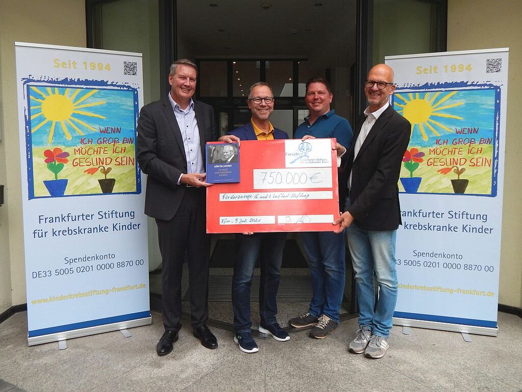 Foto: v. l.: Marcus Klüssendorf (GF Frankfurter Stiftung), Uwe Menger (Vorstandsmitglied Frankfurter Stiftung), Dr. Florian Rothweiler (Interdisziplinäres Labor für pädiatrische Tumor- und Virusforschung), Ingo Nehrbaß (GF G. u. I. Leifheit Stiftung). Foto: Leifheit Stiftung