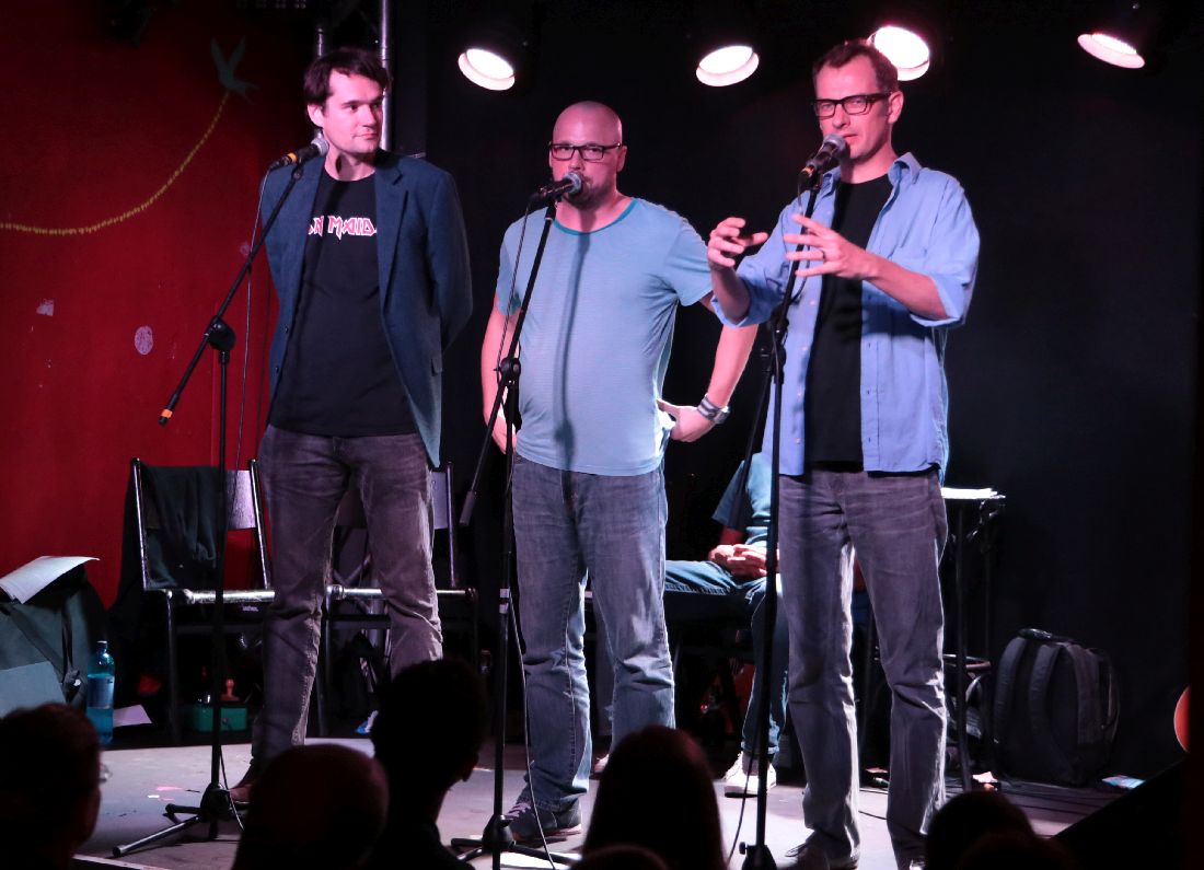 Wie die drei sich gefunden haben und wieso man Lesebühnen vertrauen sollte, wird mit Taschenlampen und Moderator Hans-Jürgen Lenhart beleuchtet. Allein schon das Aufführungsdatum lässt auf eine Sternstunde schließen.