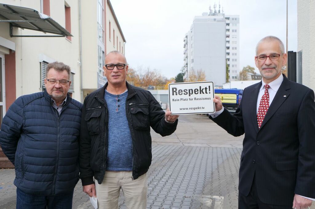 Foto (von links): Stefan Sänger (Personalchef), Abdenassar Gannoukh (Betriebsrat), Benjamin Scheffler (FES-Geschäftsführer) mit dem Respekt!-Schild vor dem Wertstoffhof Ost in Bornheim. Copyiright: FES