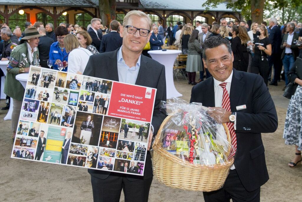 Foto: Geschäftsführer Oliver Schwebel, Wirtschaftsförderung Frankfurt, überreicht Wirtschaftsdezernent Markus Frank eine Fotoleinwand „Die Wifö sagt ‚Danke!‘ für 12 Jahre Markus Frank“ sowie einen Präsentkorb zum Abschied. Foto: Wirtschaftsförderung Frankfurt GmbH